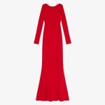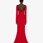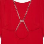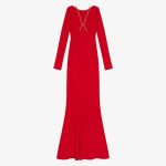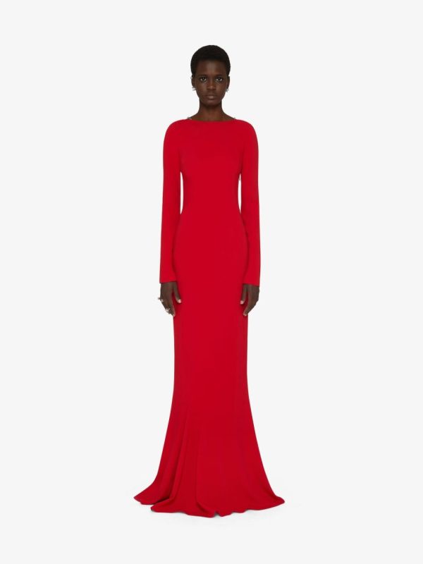 - Long dress with open back neckline and crossed G Link chain straps in silver finishing.