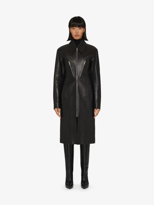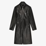 - Sleek slim-fit long coat crafted from premium calfskin leather for timeless sophistication.